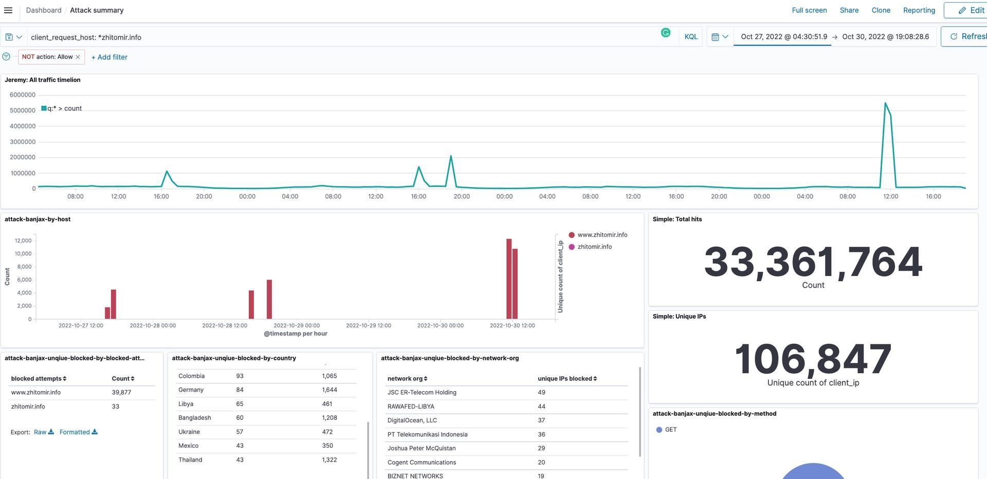 The eQualitie team mitigates DDoS attacks against Ukrainian websites on a daily basis. Ukrainian newsrooms which provide quality reports on the Russia-initiated war against Ukraine become frequent targets of DDoS. One of the regional newsrooms from Zhytomyr, onboarded to Deflect in Aug 2022, has witnessed over twenty significant attacks since then. In just three days between October 27-30, attackers generated 33,3 million malicious hits against the website, albeit to no effect.