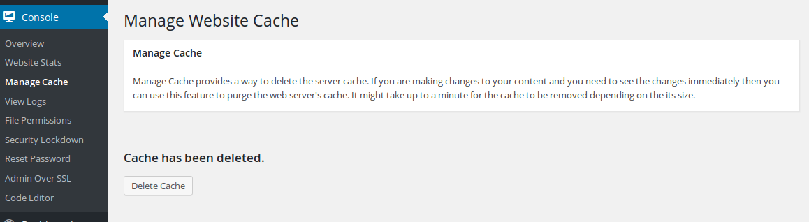 If you are making changes to your content and need to see them immediately, you can use this feature to purge the web server’s cache. Just click the “Delete cache” button and wait a bit: it might take up to a minute for the cache to be removed depending on its size.