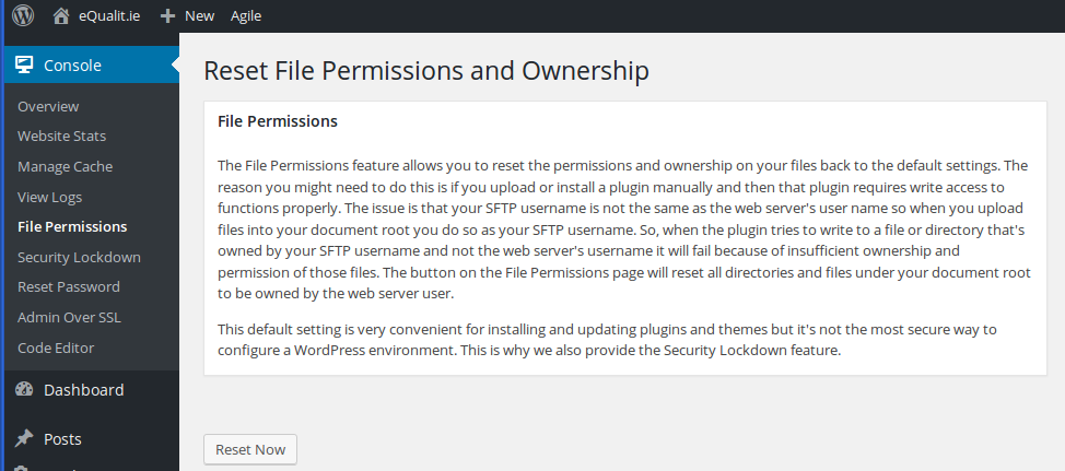 The “File Permissions” feature allows you to reset the permissions and ownership on your files back to the default settings: by clicking the “Reset Now” button, you will reset all directories and files under your document root to be owned by the web server user.
