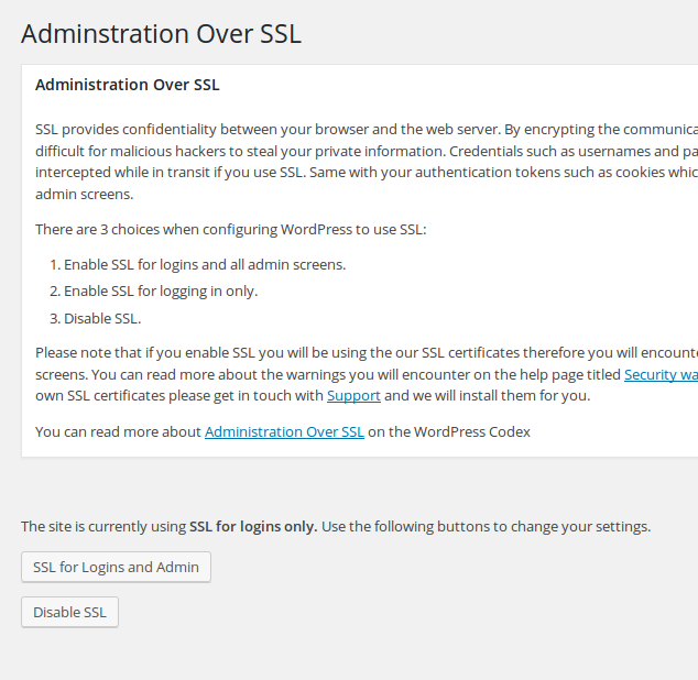 The Console offers you 3 choices when configuring WordPress to use SSL. To change the settings, click the relevant button and wait for the process to be finished before you leave the page.