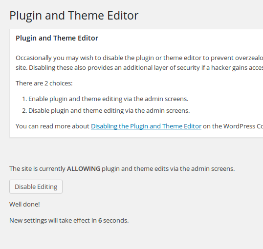 Occasionally you may wish to disable the Plugin or Theme Editor in your WordPress admin panel so as to prevent overzealous users from editing sensitive files and potentially crash the site. Disabling the editor also provides an additional layer of security if a hacker gains access to a well-privileged user account.