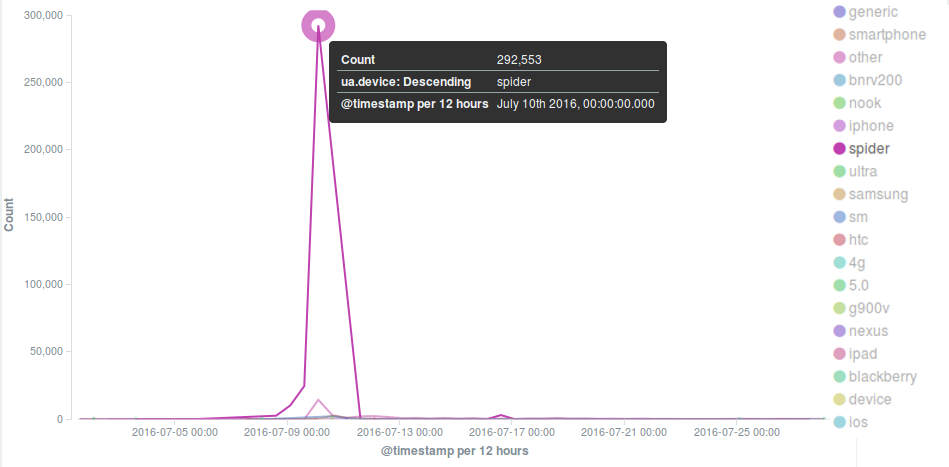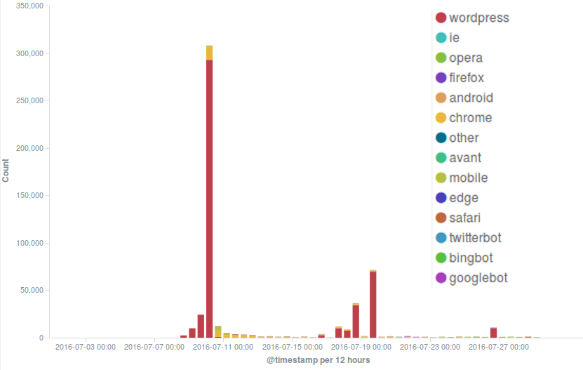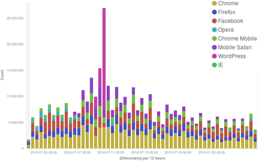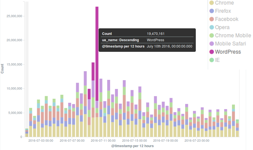 A similar pattern can be observed in the count of all connections to the Deflect network, where Google Chrome is the most used browser for regular connections to deflected websites, but a peak of “WordPress” UAs can be seen on the 10th July – those are clearly malicious requests coming from bots.