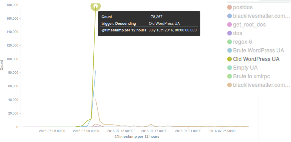 The main incident observed on the 10th July against the Black Lives Matter website triggered a dramatic increase in banning events by our banning tool Banjax, which recognized the malicious requests from their Old WordPress UA, despite the fact that bots were masquerading themselves as “spiders“.