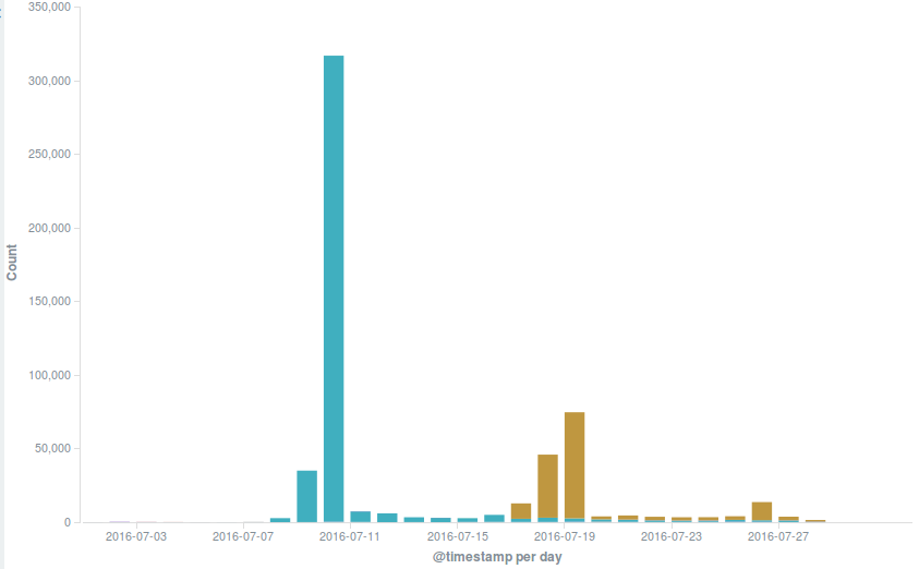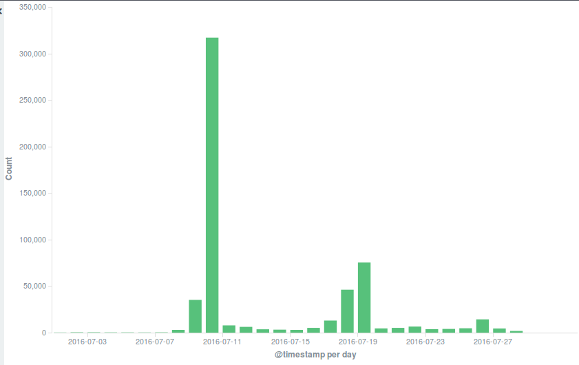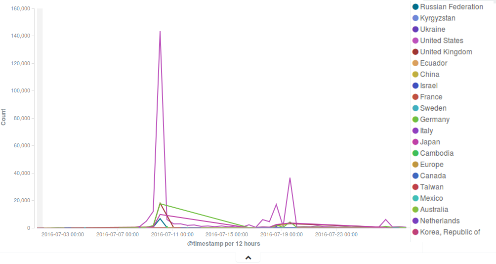 From what we can conclude from our statistics, during the month of July bot controllers must have come back from their holidays, since the traffic on the Deflect network has started to increase again and we have witnessed one of the most intense bursts of DDoS attacks we had observed so far. This series of incidents slightly increased our metrics in terms of total hits (652.8 millions vs. 514.1 millions in June) and unique visitors (8.8 millions vs. 7.8 millions in June), but in terms of banned IPs the increase was significant, with 601,219 total banning events, against 33,637 bans in June, and with 52,034 unique IPs banned, against 2,915 unique IPs banned during the previous month.
