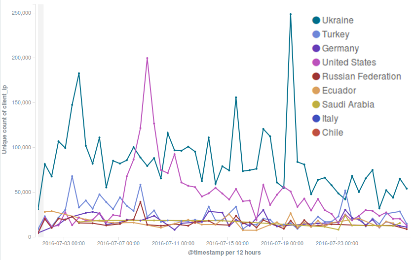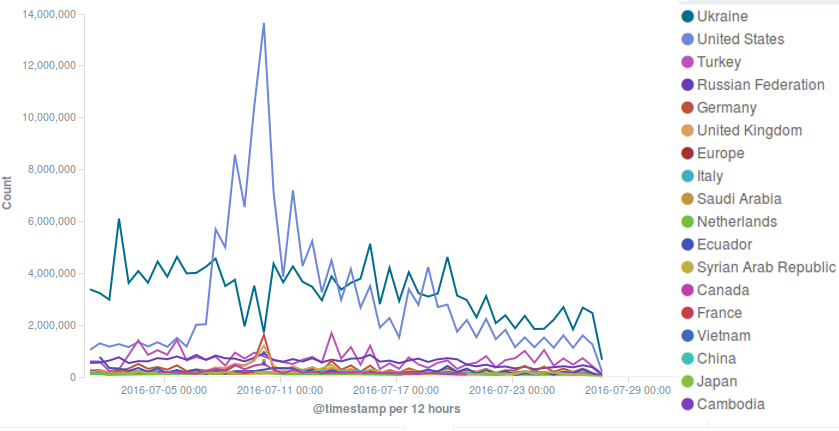 Setting aside malicious events, trends in our statistics are mostly unchanged, with a majority of connections originating from Ukraine, the United States and Turkey.