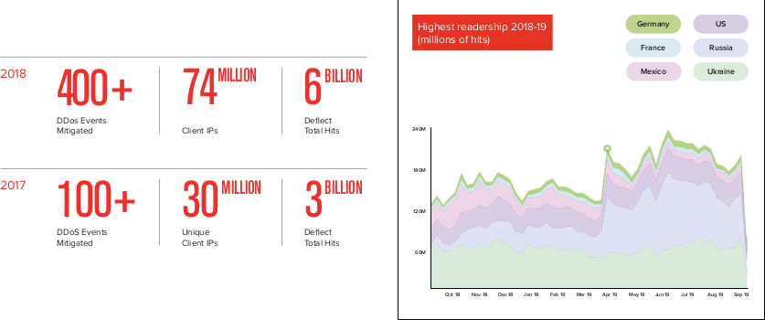 For eight eventful years, Deflect has specialized in defending high-profile human rights and independent news groups, delivering their websites to over a million daily readers and confounding the aims of state-sponsored hacking teams trying to silence them. Now we think it’s time to share our experience and time-tested tooling with enterprises and organizations looking to invest in rock solid DDoS mitigation and at the same time support an ethical company working towards sustainable revenue.