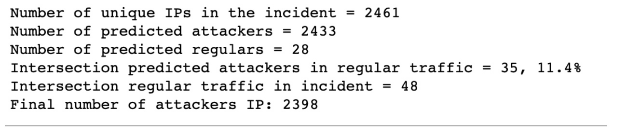 We reasoned that if an attack incident has a clearly visible traffic spike, we can assume that the vast majority of the IPs during this period are malicious, and we can train a classifier like Random Forest particularly for this incident. The only user input would be the precise time period for that incident and for the time period for ordinal traffic for that host. Such a classifier would not be perfect, but it would be good enough to be able to separate some regular IPs from the majority of malicious IPs during the time of the incident. In addition, we assume that attacker IPs most likely are not active immediately before the attack, and we do not label an IP as malicious if it was seen in the regular traffic period.