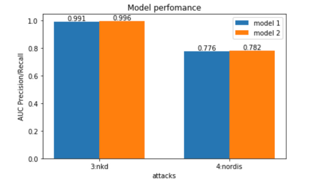 We use the Precision-Recall AUC metric for model performance evaluation. The main reason for using the Precision-Recall metric is that it is more sensitive to the improvements for the positive class than the ROC (receiver operating characteristic) curve. We are less concerned about the false positive rate since, in the event that we falsely predict that an IP is doing something malicious, we won’t ban it, but only notify the rule-based attack mitigation system to challenge that specific IP. The IP will only be banned if the challenge fails.